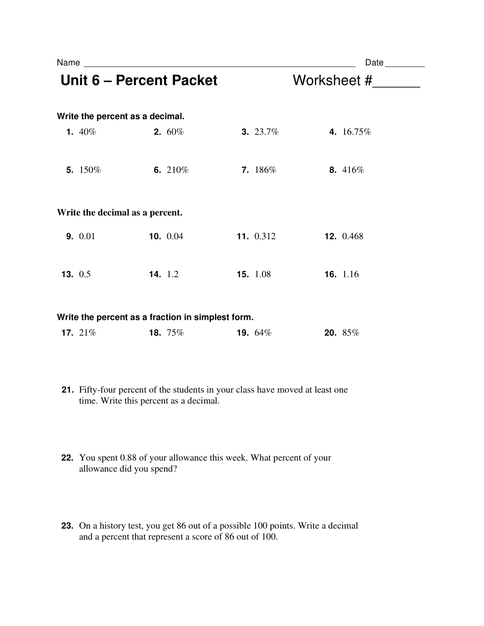 Fifty-four percent of the students in your class have moved at least one time. Write this percent as a decimal.