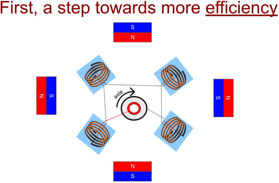 In reality, it's easier to spin something in a circle (think wind turbine or water wheel) than to push it back and forth, so electric generators actually spin the coils inside of the magnet - but the result are the same.