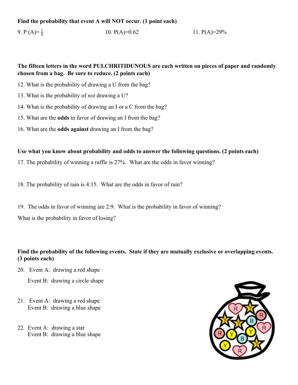 The fifteen letters in the word PULCHRITIDUNOUS are each written on pieces of paper and randomly chosed from a bag. Be sure to reduce.