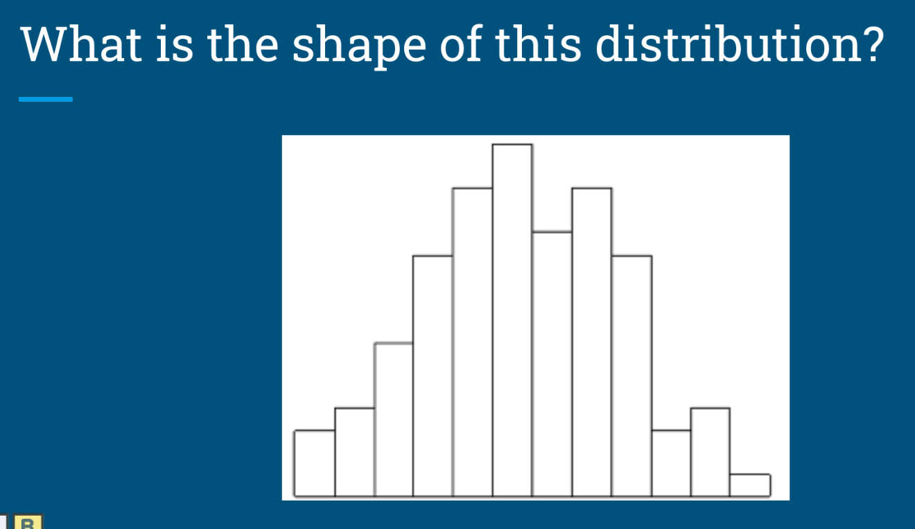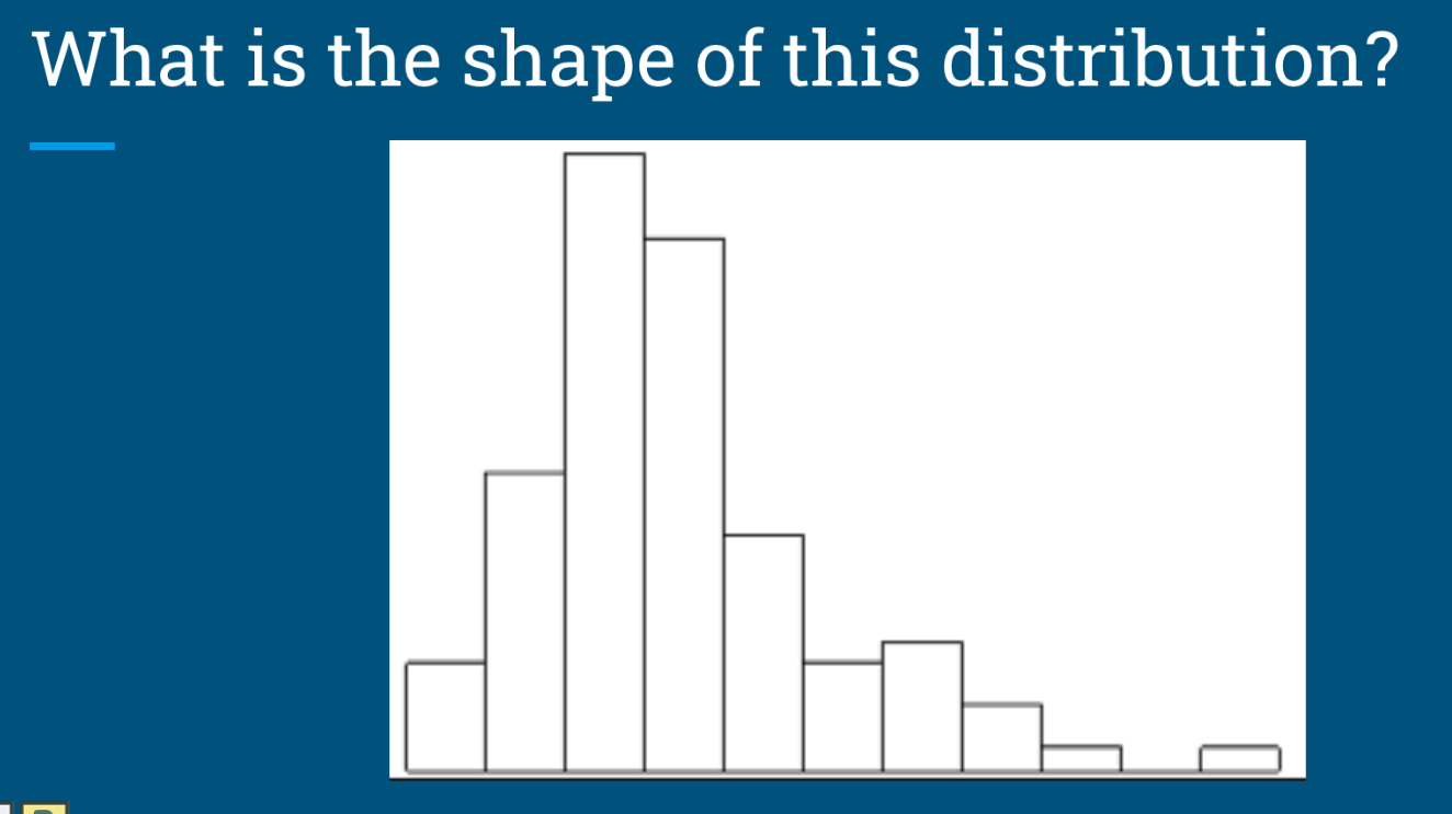 In this unit we learned that there are three unique shapes when describing distributions: approximately normal, skewed to the right, and skewed to the left. Reflect back on what you have learned about these to answer questions #7 through #10.