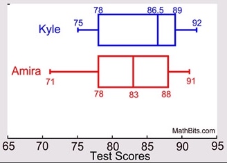 Recall that each section of a box and whisker plot is 25% of the data in the distribution--use this fact to select ALL of the statements below that are true based on the stacked box plot of Test Scores for Kyle and Amira.