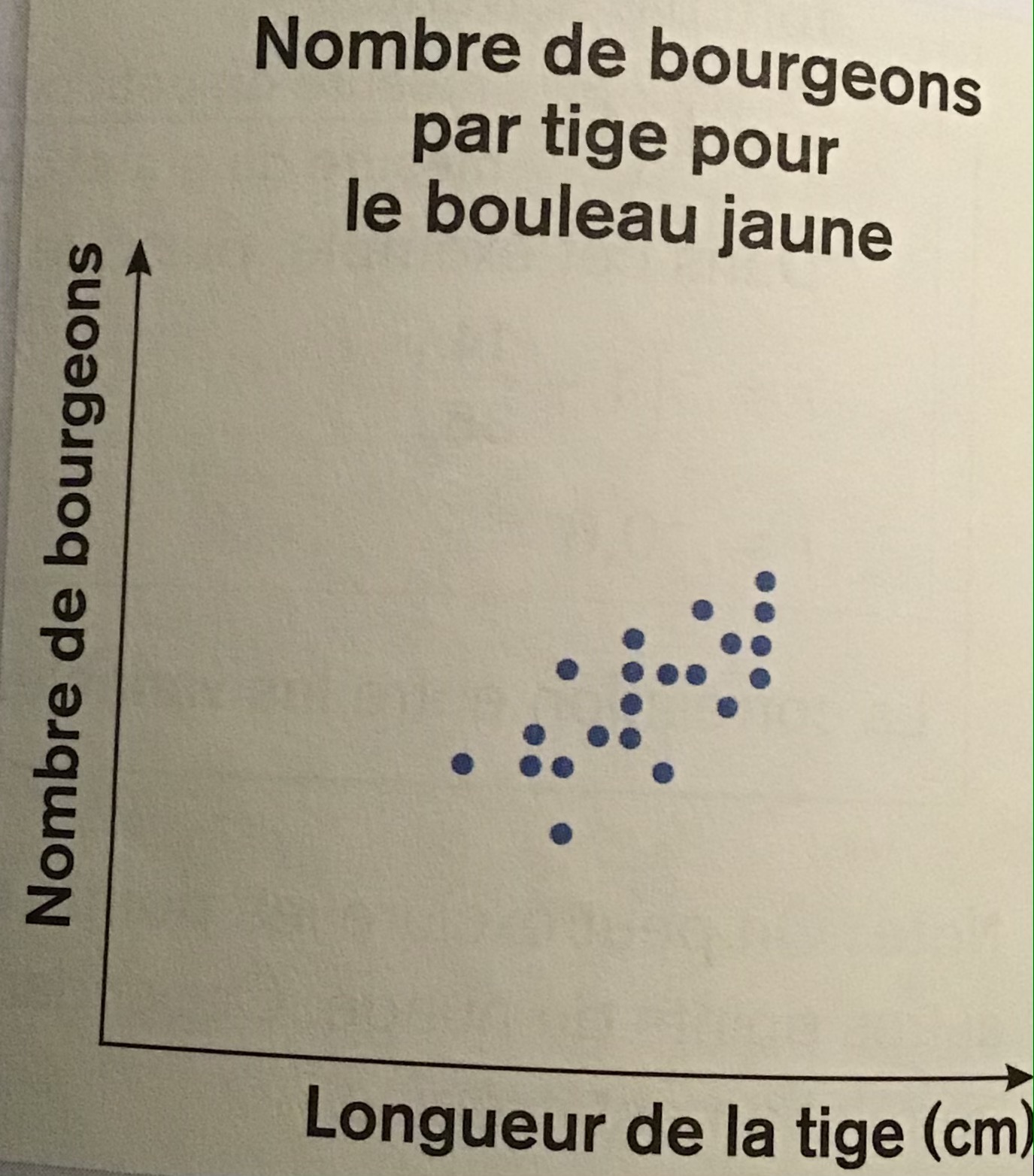 Un botaniste étudie la croissance des bouleaux jaunes. Il note la longueur des tiges (X) ainsi que le nombre de bourgeons par tiges (Y). Le graphique ci-dessous présente ses résultats.