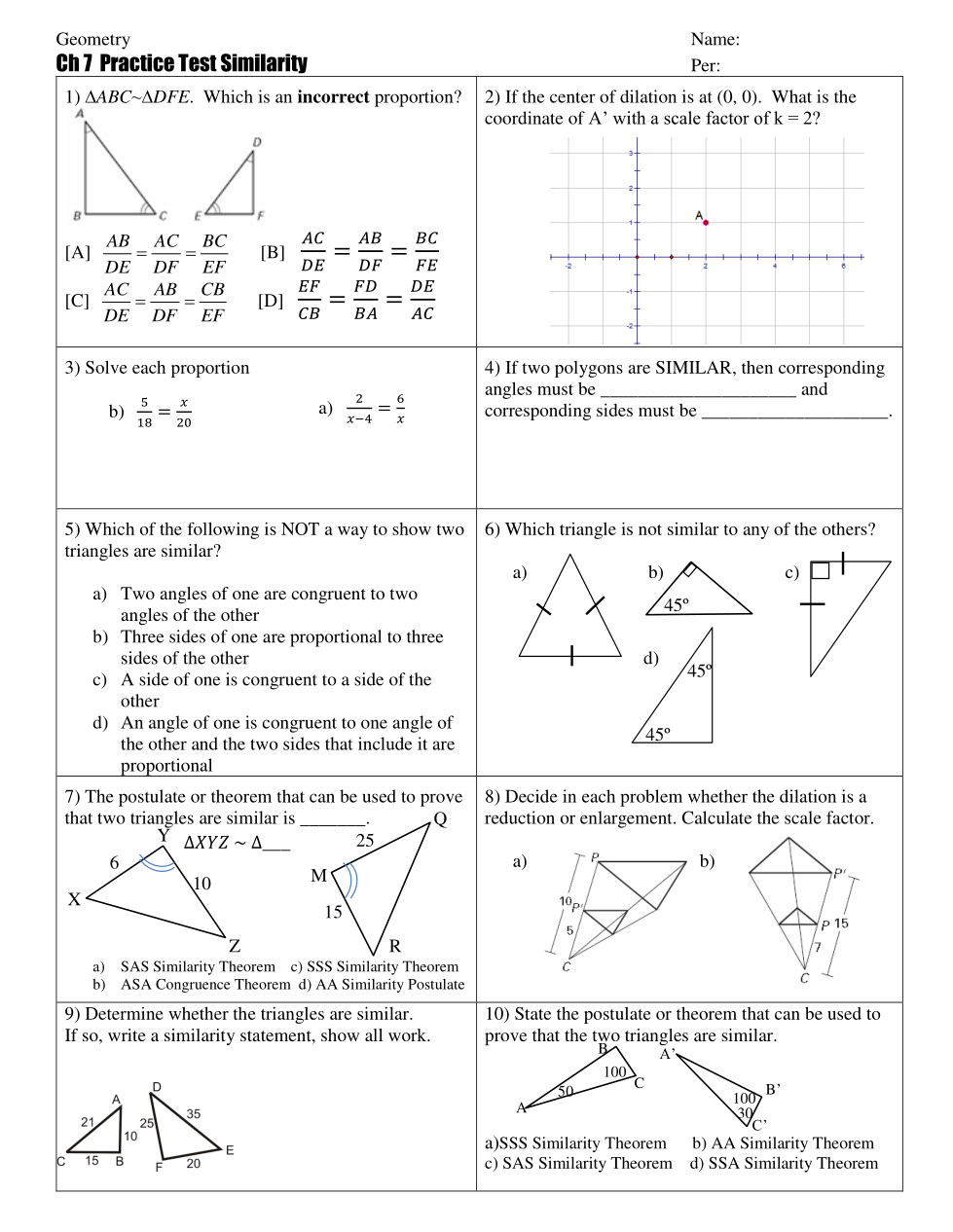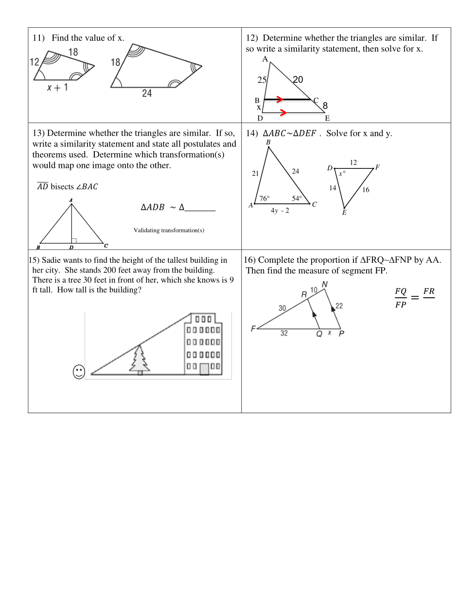 Determine whether the triangles are similar. If so, write a similarity statement and state all postulates and theorems used. Determine which transformation(s) would map one image onto the other.