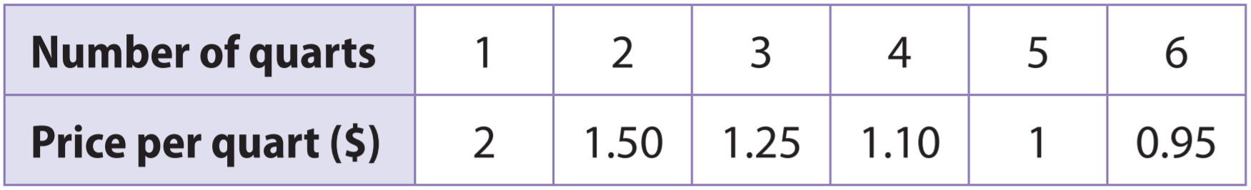 An auto store is having a sale on motor oil. The chart shows the price per quart as the number of quarts purchased increases.