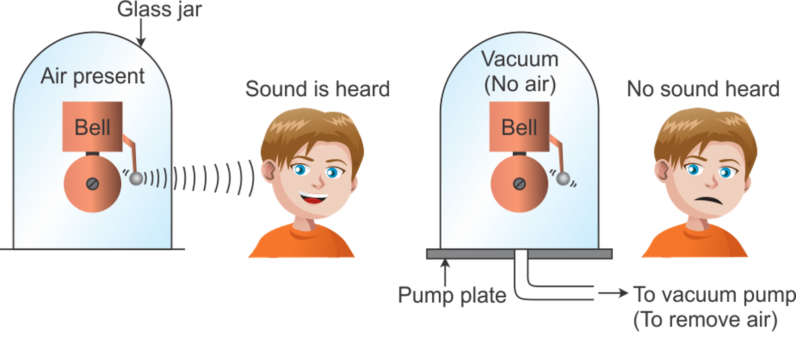 Explain this experiment using your knowledge about how sounds are made and how they travel.Use key words: vacuum, sound waves, vibrations