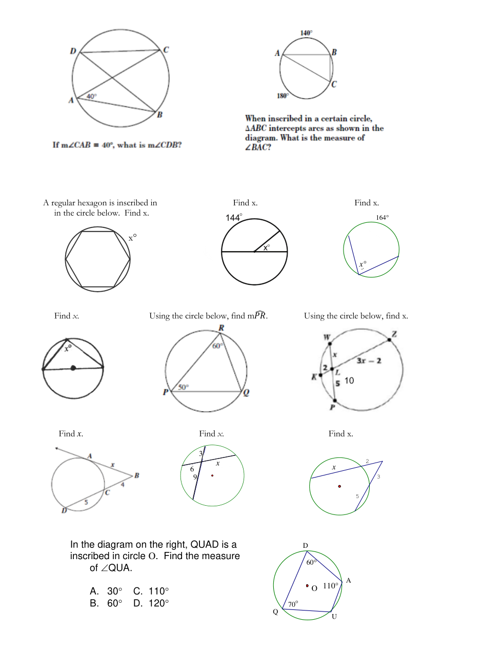 Using the circle given, find the measure of arc PR. (hint..this arc is intercepted by angle RQP. Find that angle and then use the inscribed angle formula to find the arc)