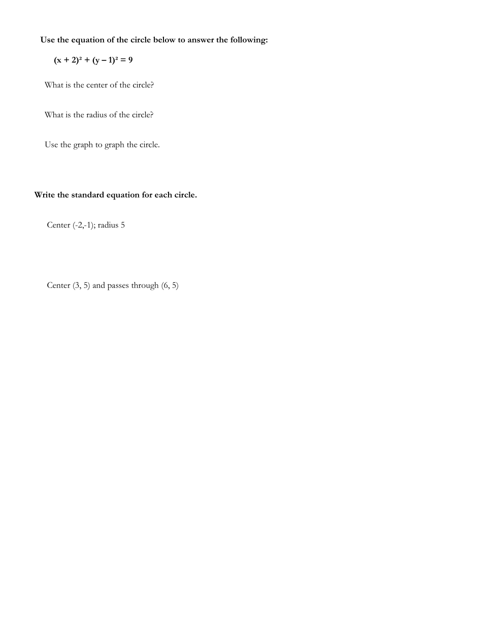 Given a circle with Center (3, 5) and it passes through point (6, 5), write the equation of the circle below. (hint: use the distance formula to find the radius, using the 2 points given)