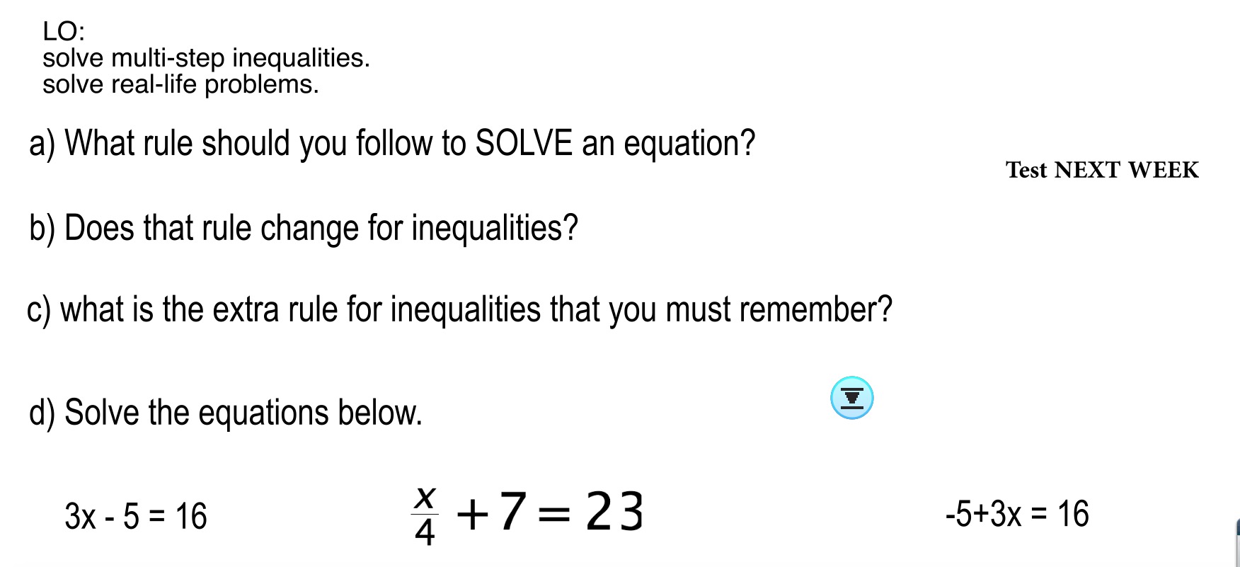 You have the chapter 4 test on the second lesson of next week (week starting 18th).