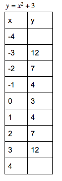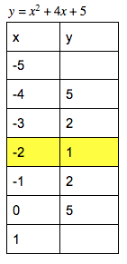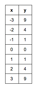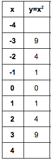 Move from the vertex of (0,0) in the table in both directions and see if you can figure out the pattern in the y-values. What would the y-values in the blank boxes be?