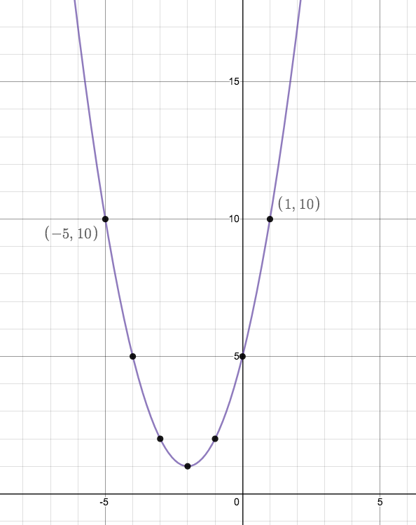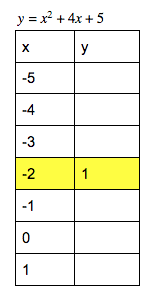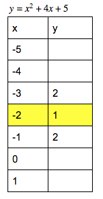 Some people used the "1-3-5" pattern to fill in the previous table, and others may have done the math in their head or on the calculator. With an equation like the one below, using the pattern can be a little easier. If (-2,1) is the vertex (highlighted), use the "1-3-5" pattern to figure out the value for x=-3 and x=-1.
