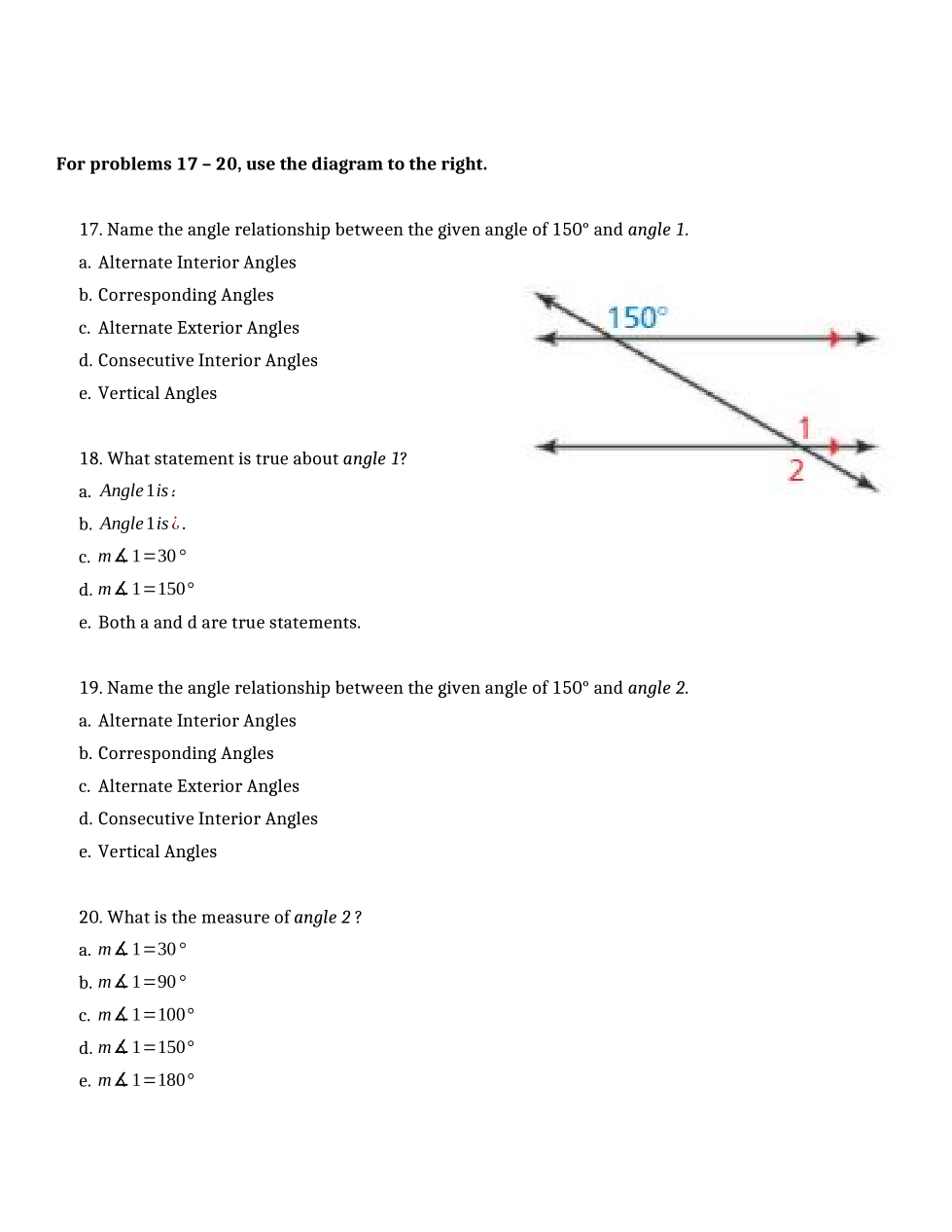 Name the angle relationship between the given angle of 150 degrees and angle 2.