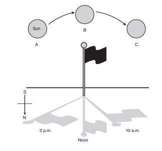 Ms. Thomas’s class has been observing the flagpole at school and how its shadow changes during the day. They created a diagram of what they observed, but left out the labels for the position of the Sun in the sky.