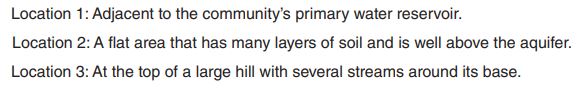Your community is going to build a second landfill, and some residents are concerned about waste contaminating the water supply. Your community has two main water supplies: a large lake reservoir that is fed by smaller streams, and an aquifer, which is an underground storage area for water. The three proposed locations for the landfill are listed below. In which location would the landfill be the least harmful to your community’s water supply? Explain.