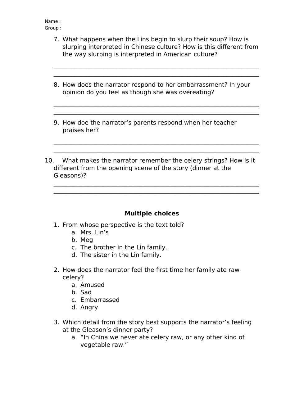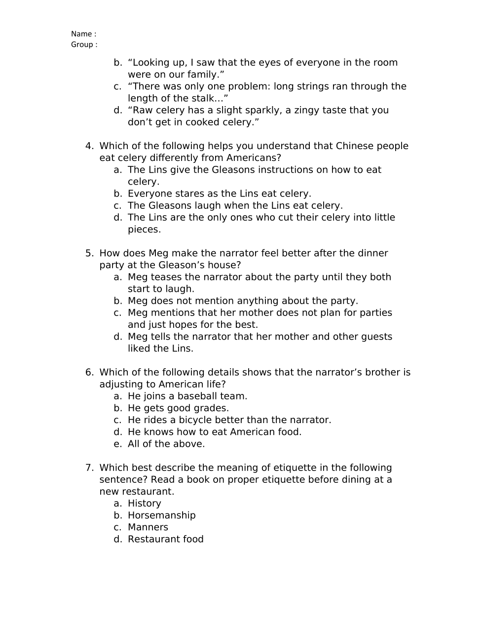 Which of the following helps you understand that Chinese people eat celery differently from Americans?