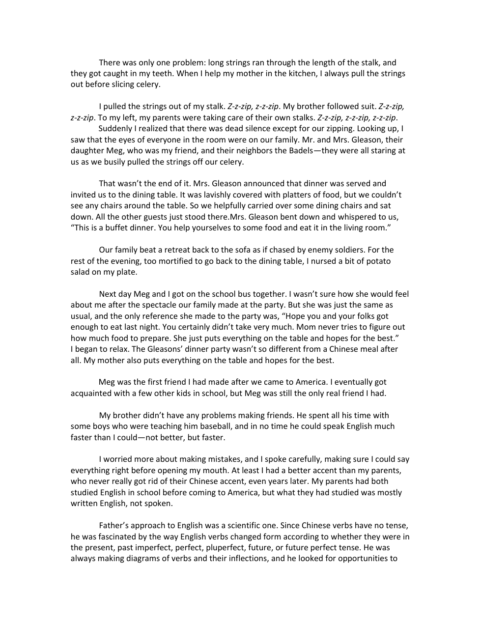 What makes the narrator remember the celery strings? How is it different from the opening scene of the story (dinner at the Gleasons)?
