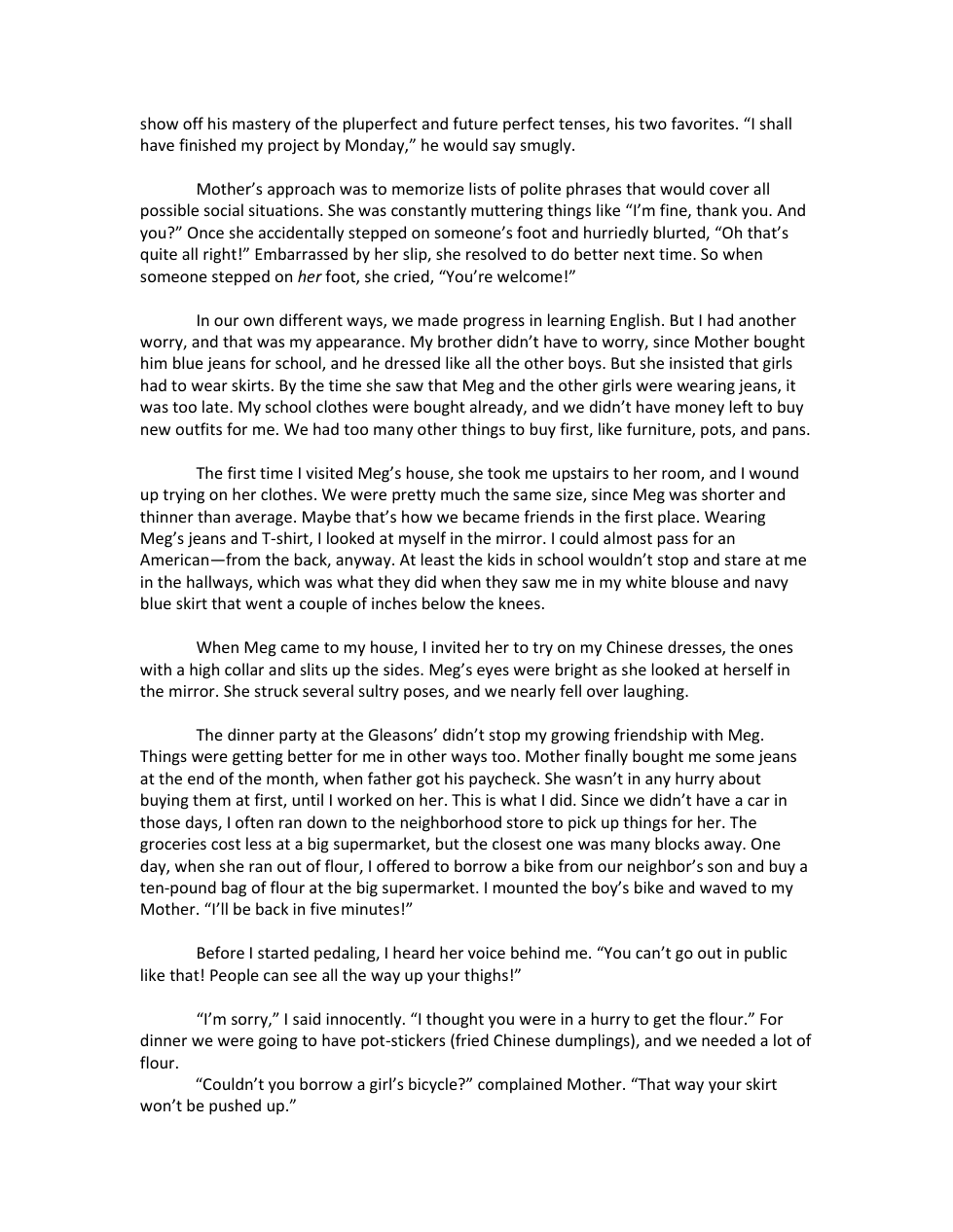 Which of the following detail (1) shows that the narrator's brother is adjusting to American life?