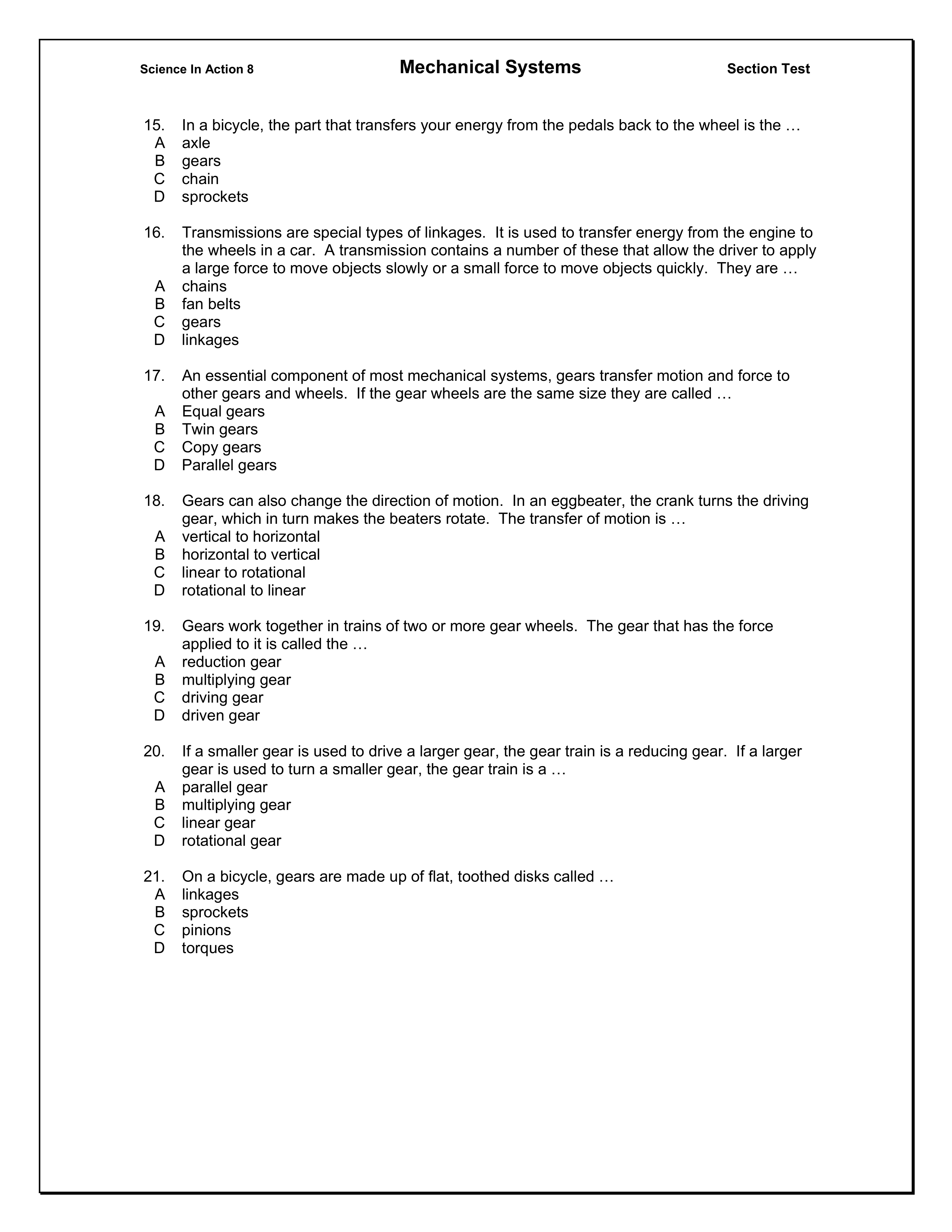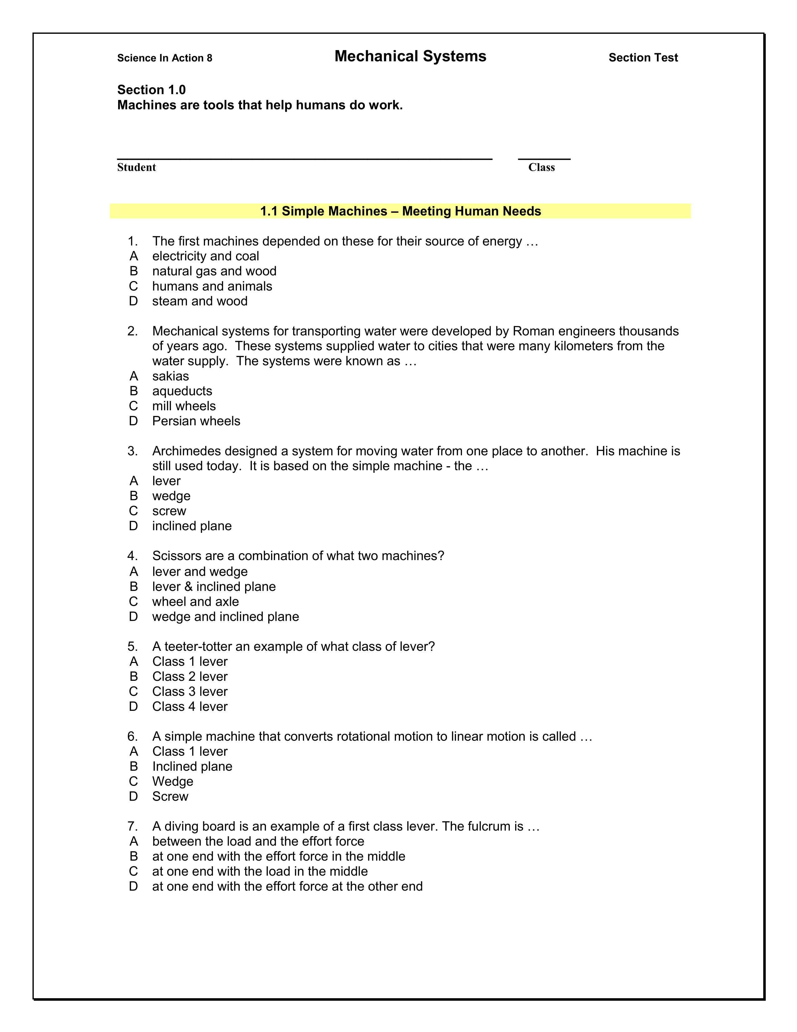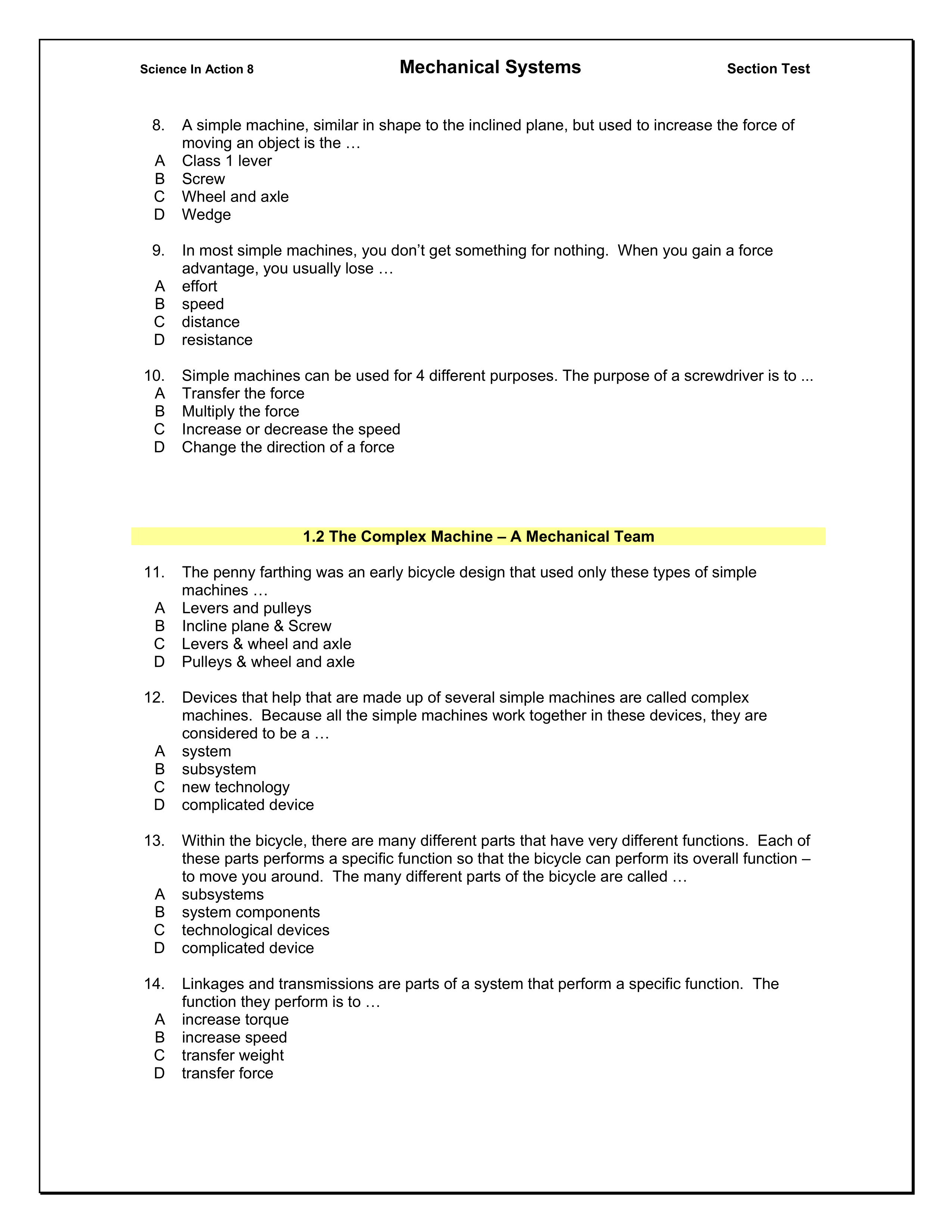 Science 8-2: Mechanical Systems Section 1.0 Quiz
