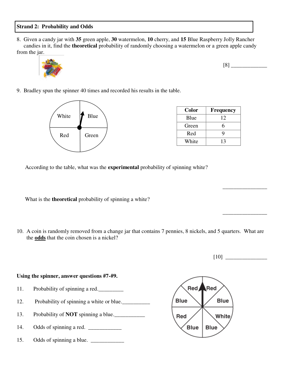 Bradley spun the spinner 40 times and recorded his results in the table. What was the theoretical probability of spinning a white?