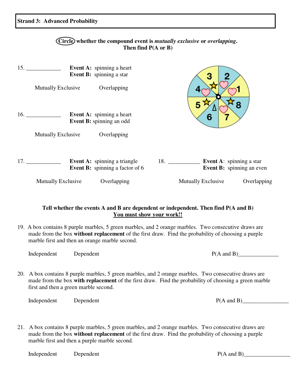 Circle whether the compound event is mutually exclusive or overlapping. Then find P(A or B)