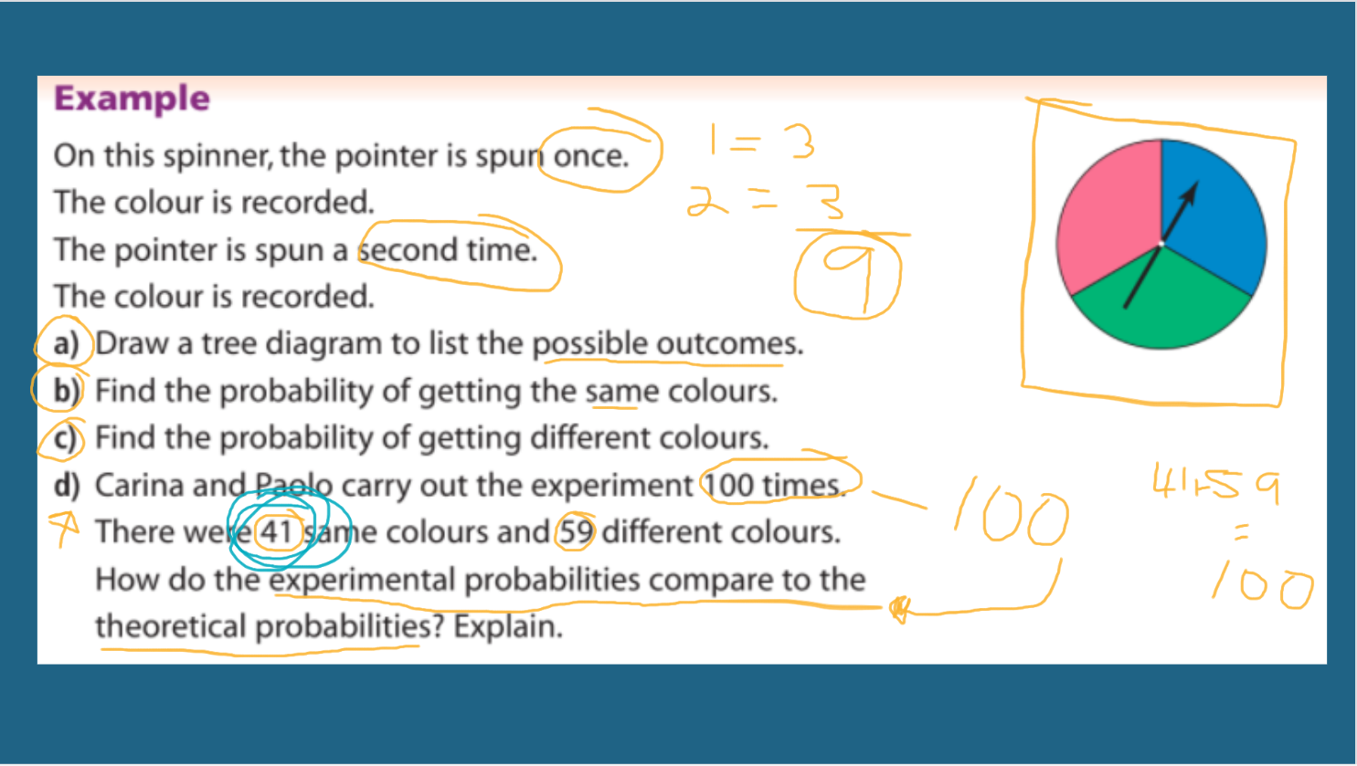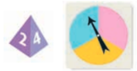Rolling a tetrahedron labeled 1 to 4 and spinning a pointer on this spinner.