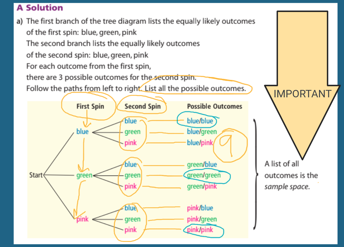 Create a tree diagram that shows all the possible outcomes for the following "independent events".Rolling a tetrahedron labeled 1 to 4 and spinning a pointer on this spinner.
