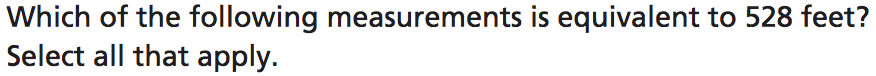 ¿Cuál de las siguientes medidas equivale a 528 pies? Seleccione todas las que correspondan.