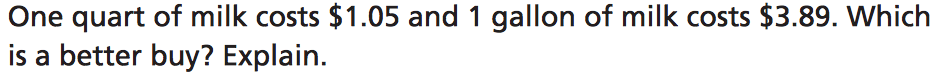 Un cuarto de leche cuesta 1.05 dólares y un galón de leche 3.89 dólares. ¿Cuál es una mejor compra? Explícate.