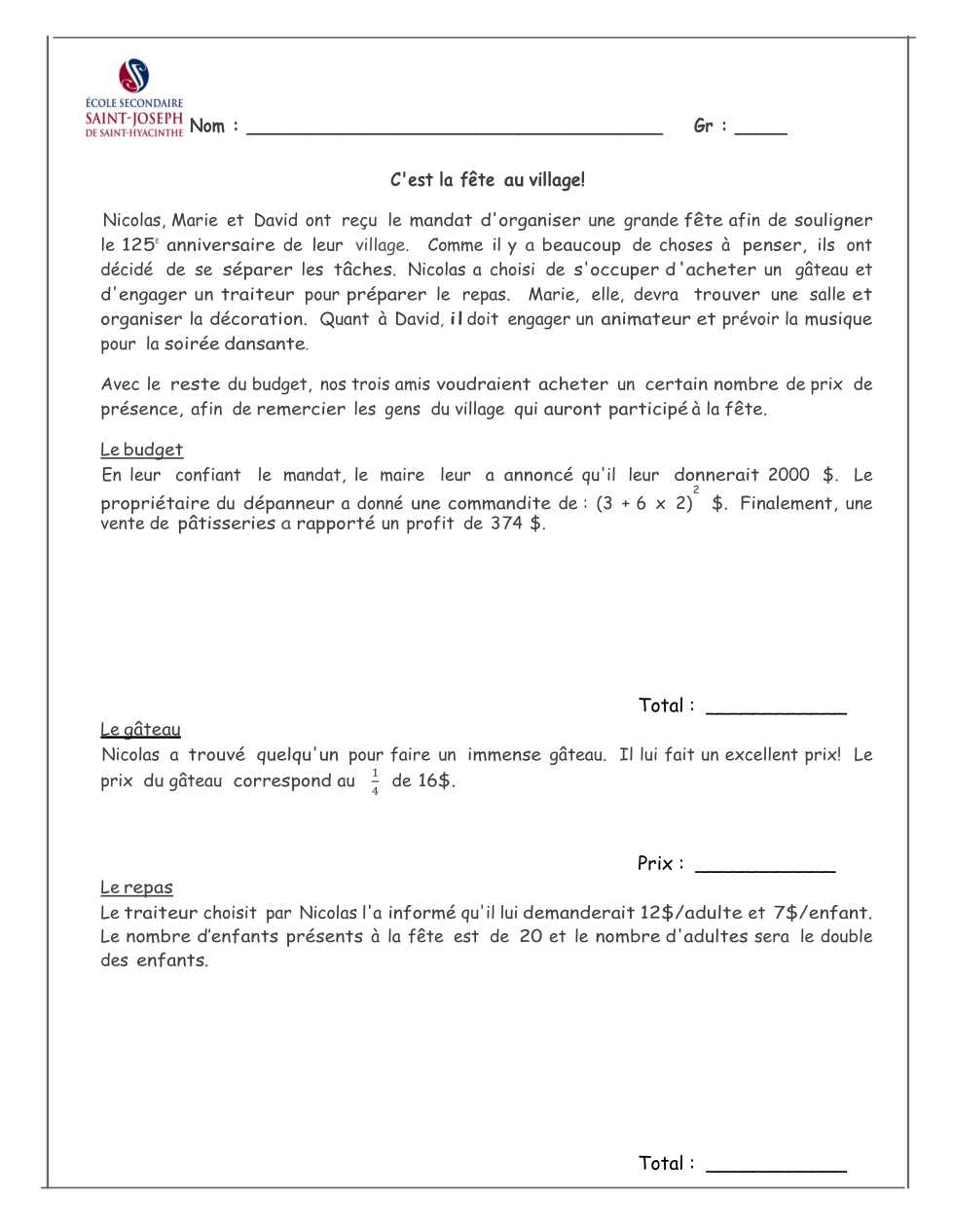 Le budgetEn leur confiant le mandat, le maire leur a annoncé qu'il leur donnerait 2000 $. Le propriétaire du dépanneur a donné une commandite de : (3 + 6 x 2)2 $. Finalement, une vente de pâtisseries a rapporté un profit de 374 $.Total : ____________
