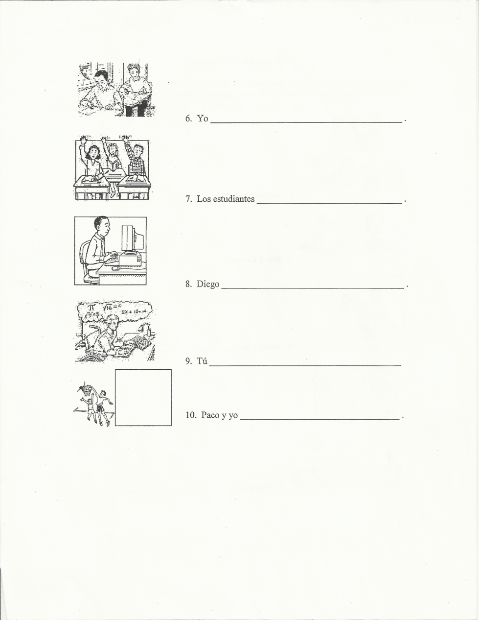 Finish the sentence with the correct form of tener for the subject + que + what they are doing in the picture. (They have to answer the question)