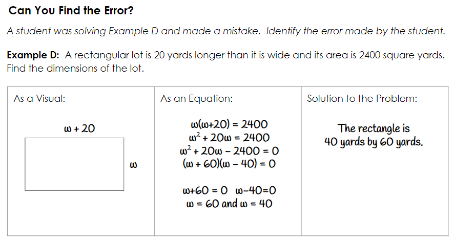 Example B: A rectangle has a width that is 5 feet less than the length. The area of the rectangle is 126 square feet. Find the dimensions of the rectangle.