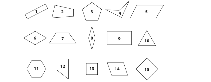 Look at the set of shapes. Click on ALL of the shape numbers that are QUADRILATERALS.
