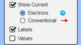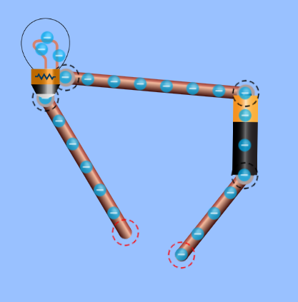 In the top right corner, while the circuit is connected and the bulb is lit up, switch the current from electrons to conventional. Describe the motion of the electrons and how it differs from the conventional direction.