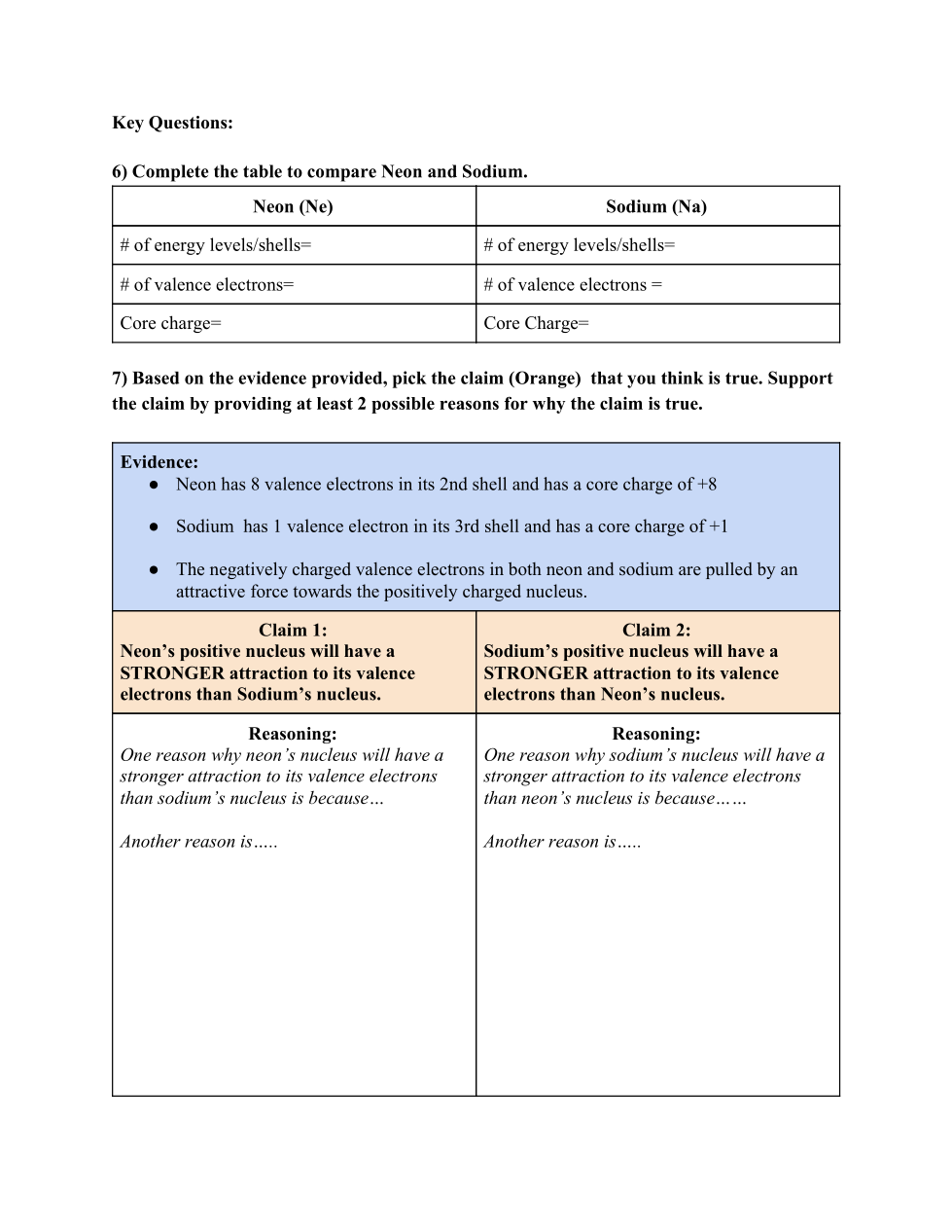 Drag the numbers to each term below to determine the # of energy levels/shells, valence electrons and core charge for Na
