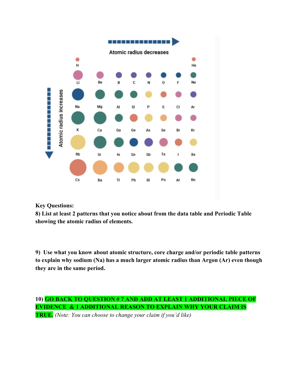 List at least 2 patterns that you notice from the data table and Periodic Table showing the atomic radius of elements.