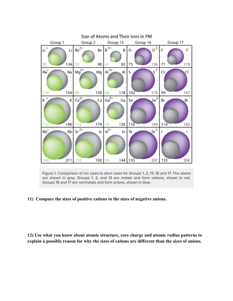 Use what you know about atomic structure, core charge and atomic radius patterns to explain a possible reason for why the sizes of cations are different than the sizes of anions.