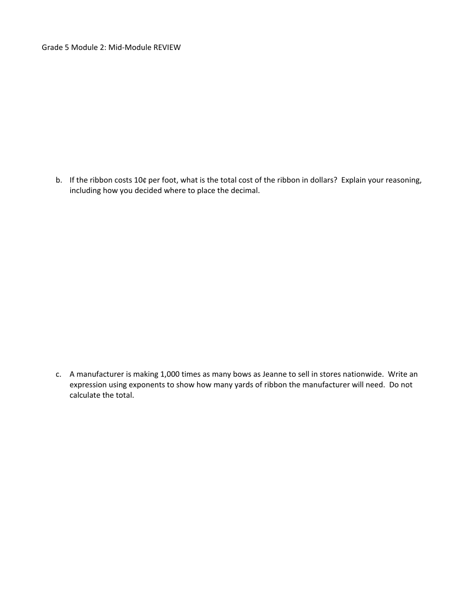 A manufacturer is making 1,000 times as many bows as Jeanne to sell in stores nationwide. Write an expression using exponents to show how many yards of ribbon the manufacturer will need. Do not calculate the total.