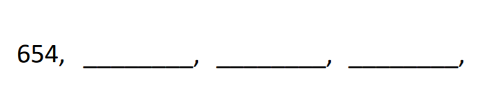 A pattern has the rule “subtract 6” and starts with the number 654. What are the next four numbers in the pattern? Type the next three numbers, and leave a space in between each number.
