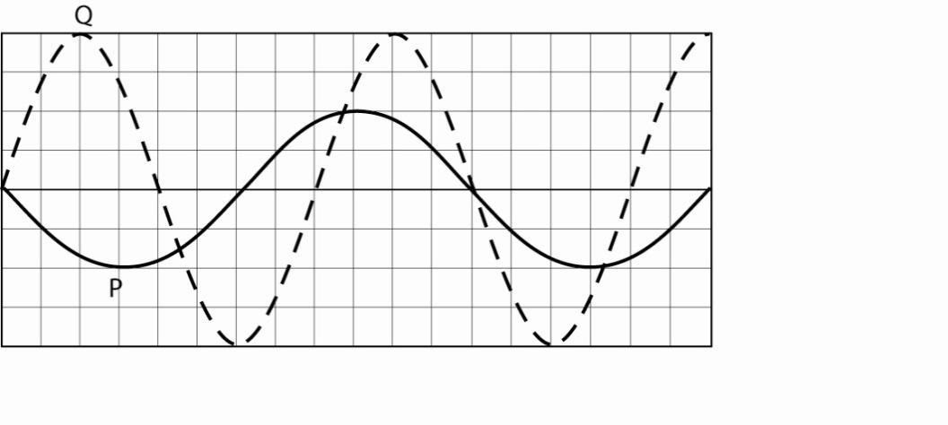 Uit twee luidsprekers P en Q komen verschillende tonen. Het oscilloscoopbeeld van beide tonen is in de figuur hieronder weergegeven.