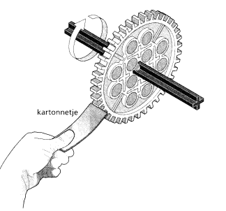Erik houdt een stukje karton tegen de tanden van het tandwiel, daardoor ontstaat een toon.