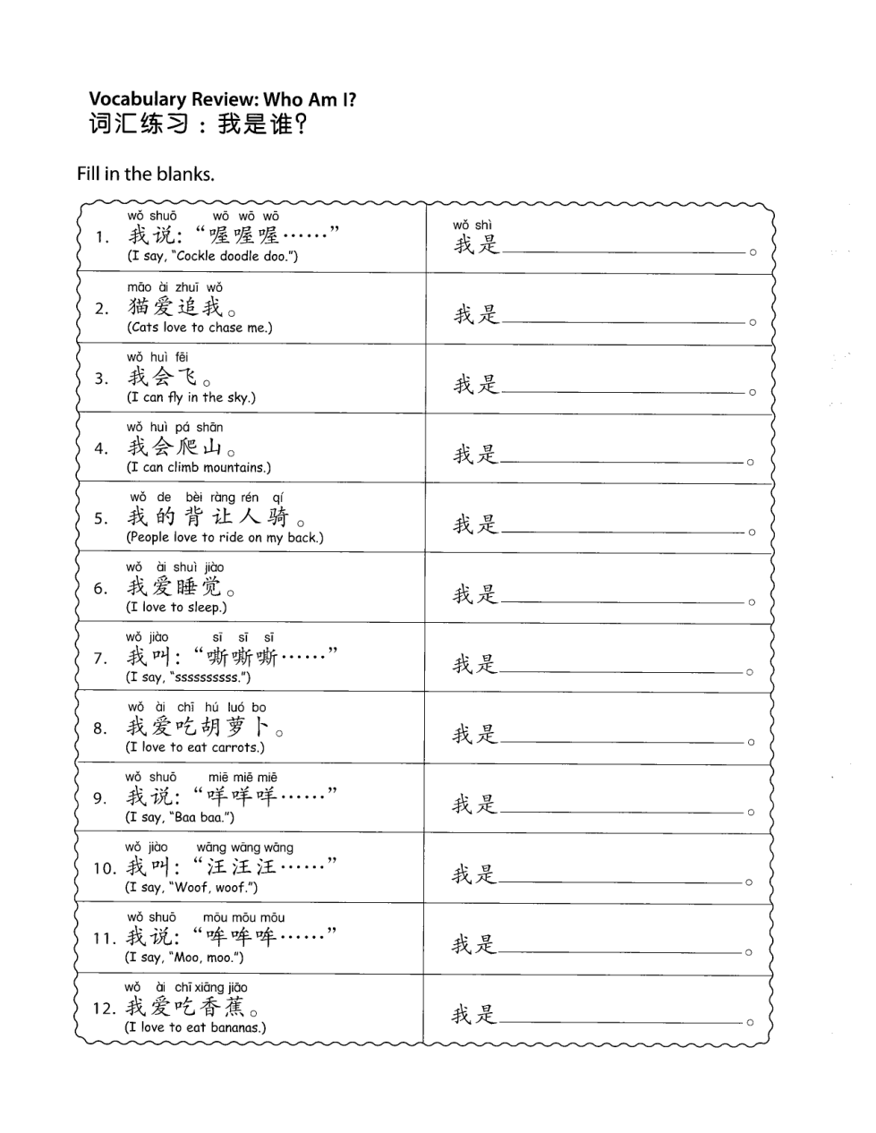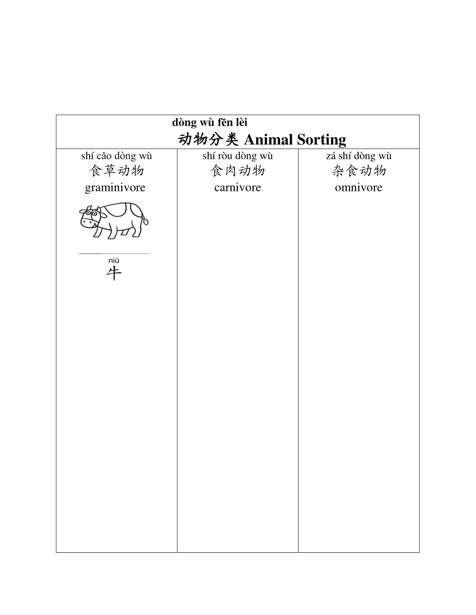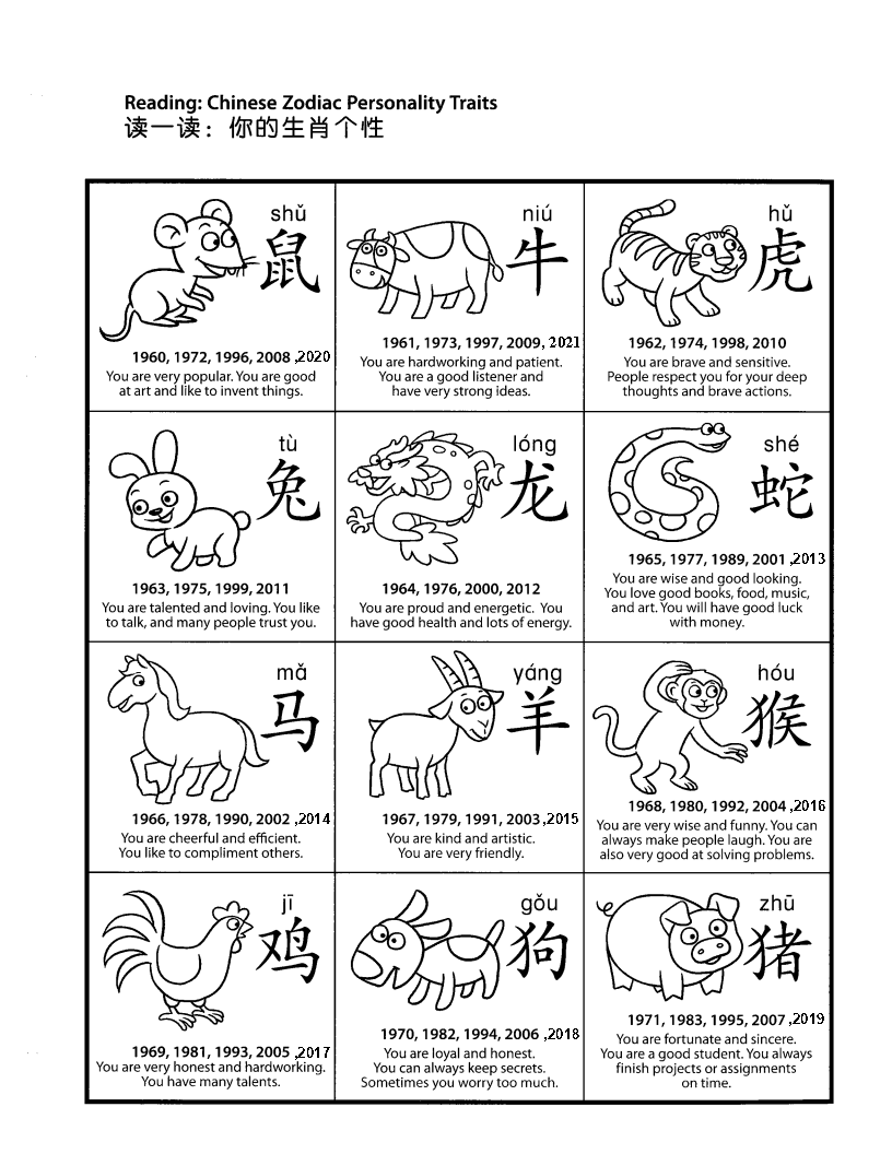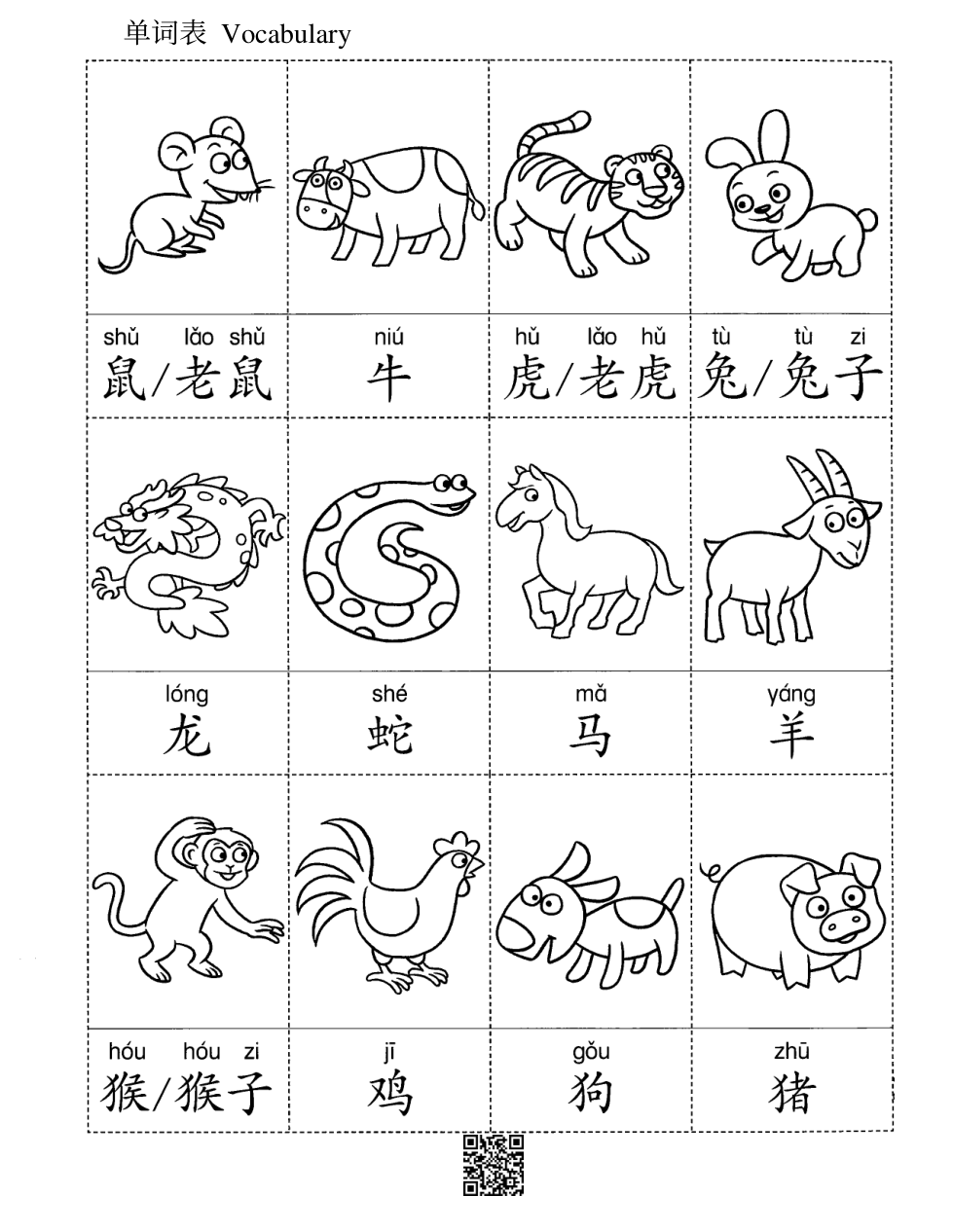 Students' first name from A-D draw 鼠shǔ,牛niú; E-G draw 虎hǔ,兔tù; H-K draw 龙lóng,蛇shé; L-N draw 马mǎ,羊yáng; O-R draw 猴hóu,鸡jī; S-Z draw 狗gǒu,猪zhū;and write down its pinyin and Chinese character next to it.