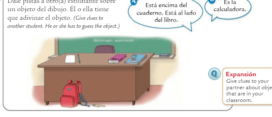 3. Está debajo del escritorio. Está detrás de la mochila y la pluma. Está delante del pizarrón. ¿Qué es?