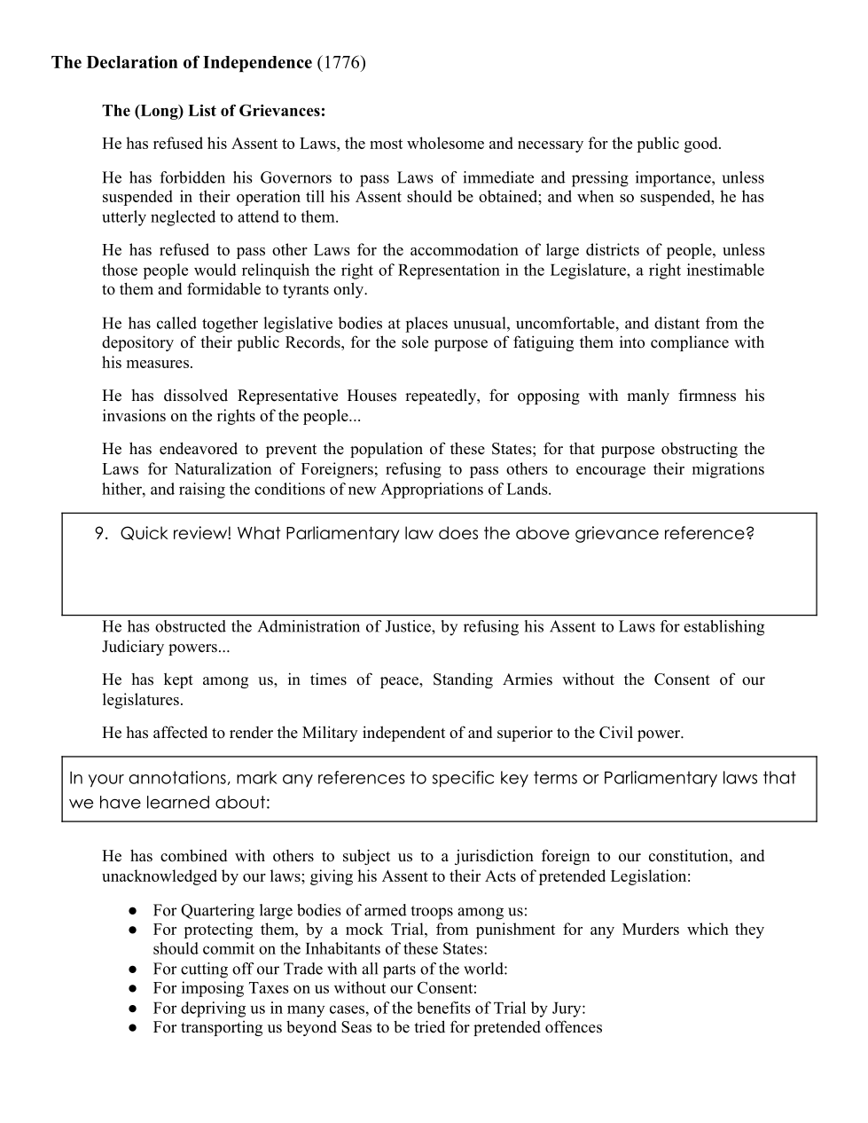 In your annotations, mark any references to specific key terms or Parliamentary laws that we have learned about: