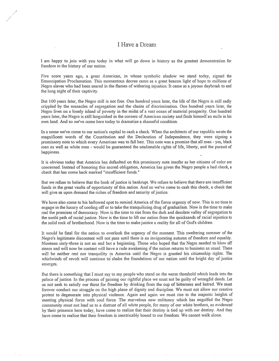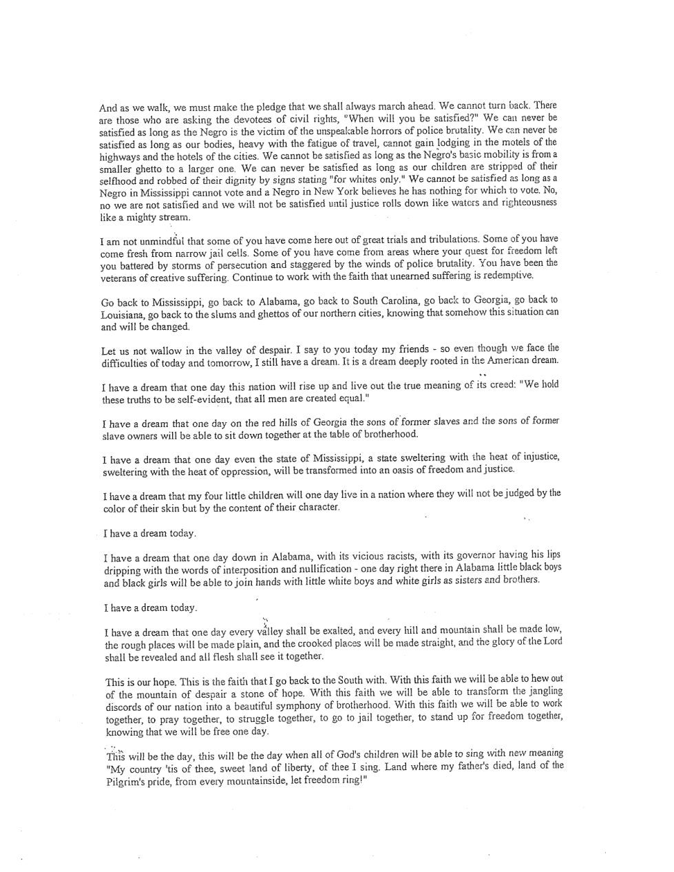 Dr. King used repetition in multiple ways in his "I Have a Dream" speech to make his points. In the space below, record the phrases that you found in the speech that Dr. King repeated multiple times. (You should have multiple phrases recorded below.)