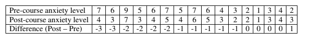 Before you took this course, you may have heard stories about how difficult Statistics can be. Oftentimes, parents have had bad experiences with Stats courses and pass on their anxieties to their kids. To test whether actually taking AP Stats actually decreases students' anxieties about Stats, an instructor gave a test to rate student anxiety at the beginning of the course and at the end of the course. Anxiety levels were measured on a scale of 1-10. Here are the data for 16 randomly chosen students from a class of 180 students.