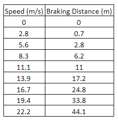 Given the equation above, what would you expect the breaking distance to be at a speed of 30 miles an hour?
