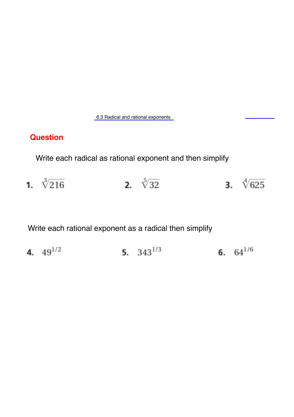 Write each rational exponent as a radical then simplify.