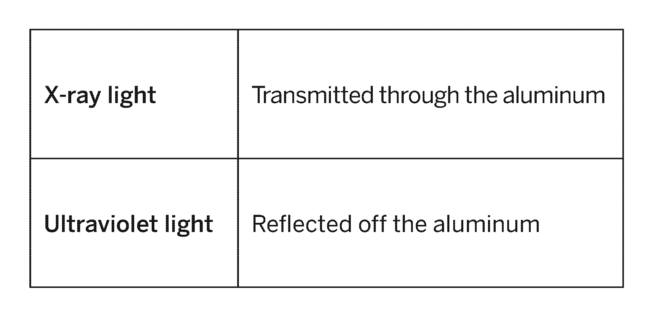 Maya wonders which types of light could heat up a sheet of aluminum. The table below shows what happens when different types of light hit the aluminum.