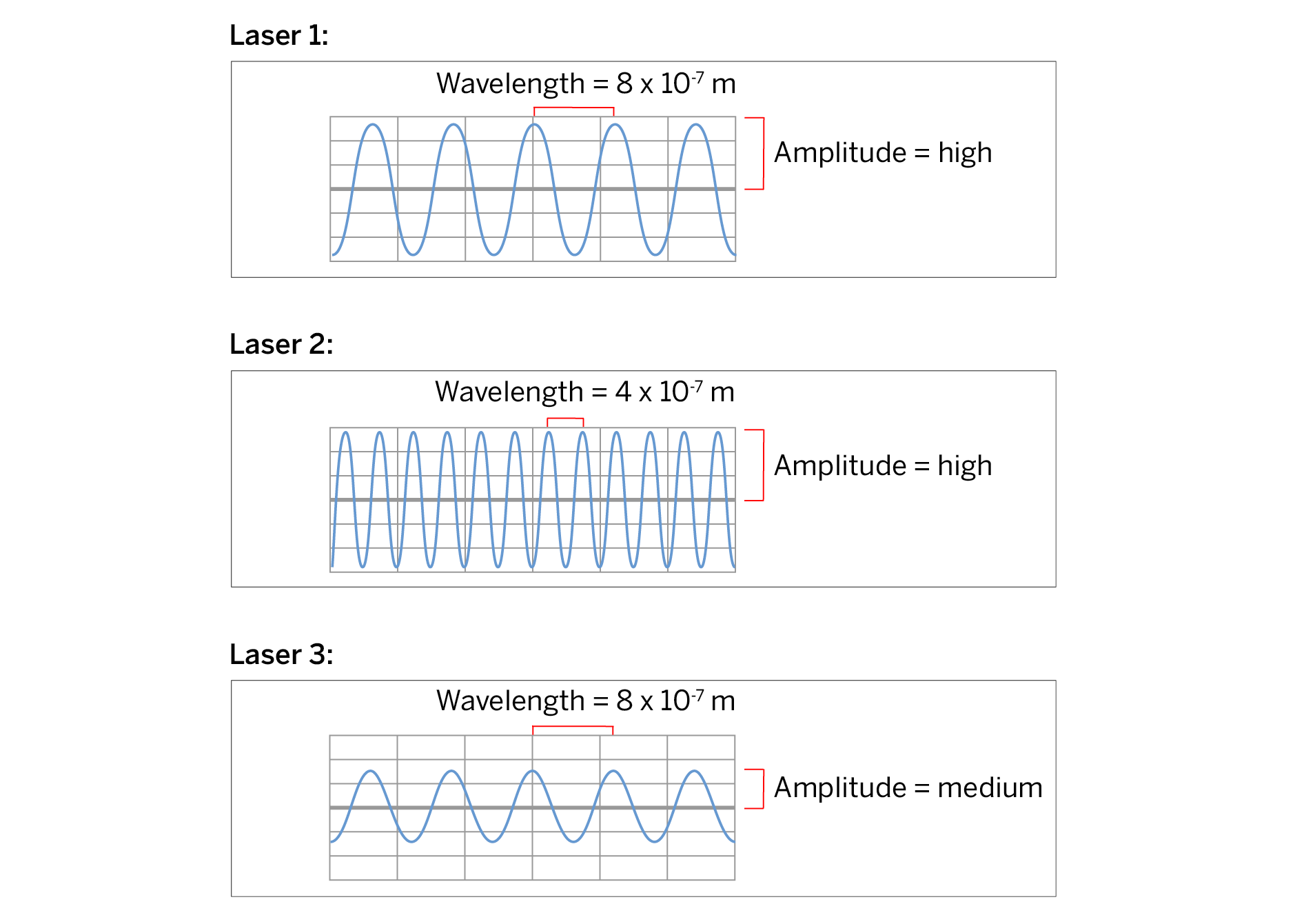 These graphs show the wavelength and amplitude of light coming from three lasers. Could any of these lasers be giving off a different type of light?