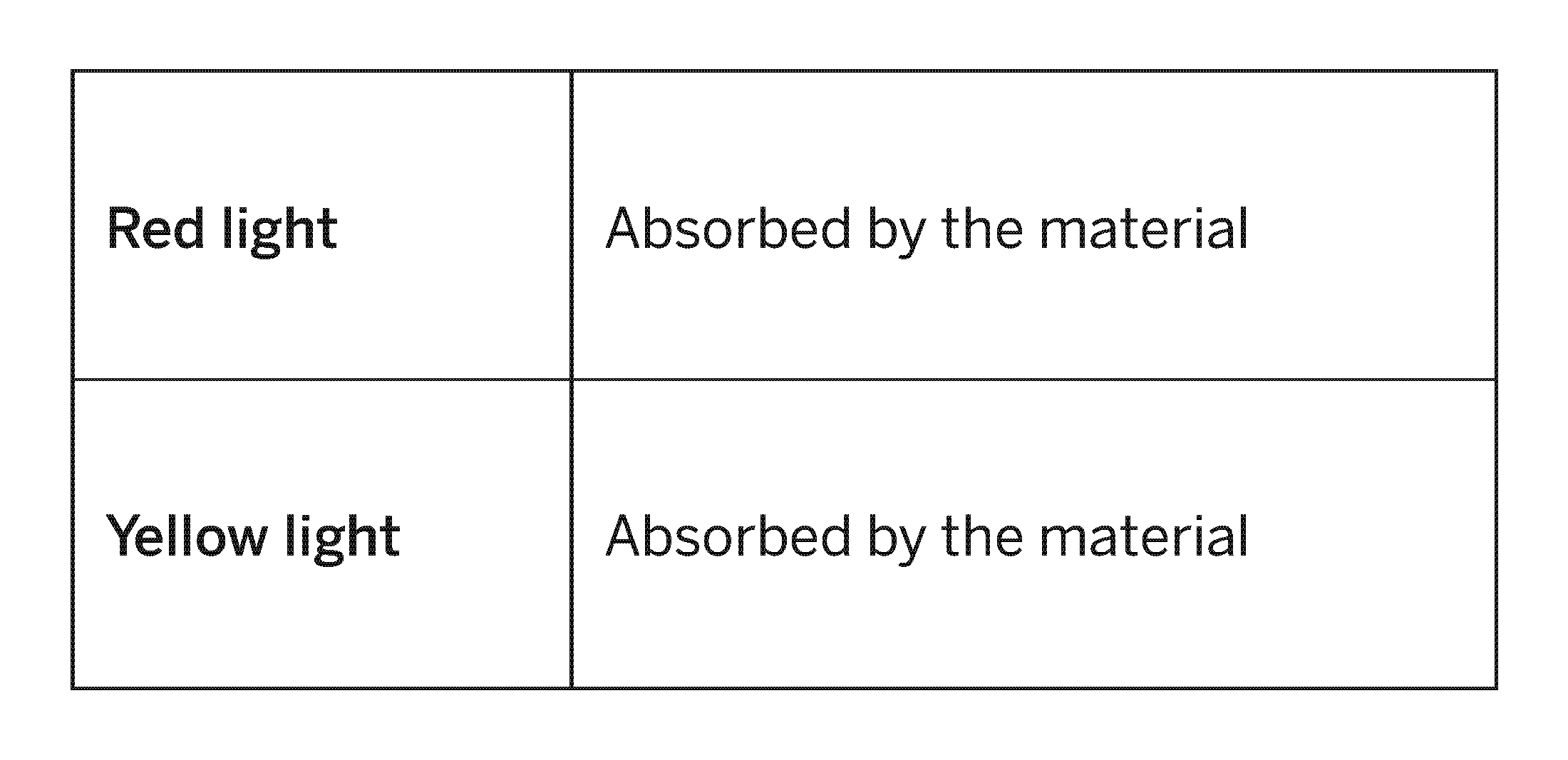 Ana wonders how light can affect a mystery material. The table below shows what happens when different types of light hit the mystery material.