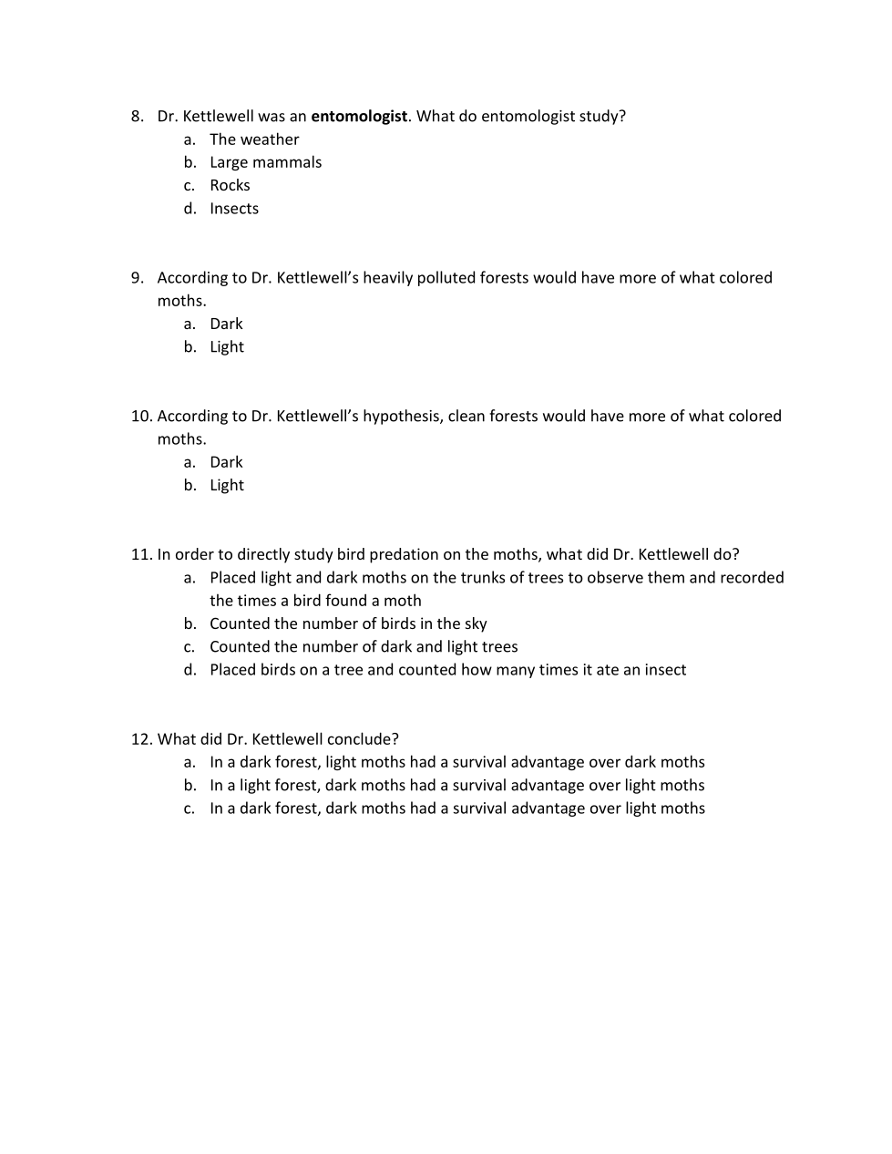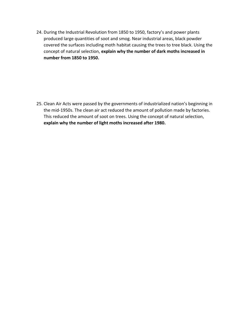 Peppered moth are examples of natural selection, why was there a shift in the color of moths from light to dark (answer can be found in the second paragraph under the Natural Selection Header)